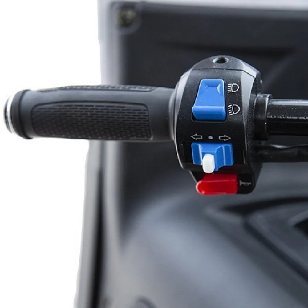 Удобство и комфорт езды обеспечены 2 мягкими анатомическими сиденьями. Наличие крыши позволяет спрятаться от негативного воздействия ультрафиолета и осадков. 12 дюймовые нактистые колеса способны преодолевать подъемы до 15 градусов, обеспечивать плавность езды по неровностям. Скорости контролируются с помощью ручки газа. Важные технические параметры с помощью бортового компьютера, размещенного на видимой части панели.