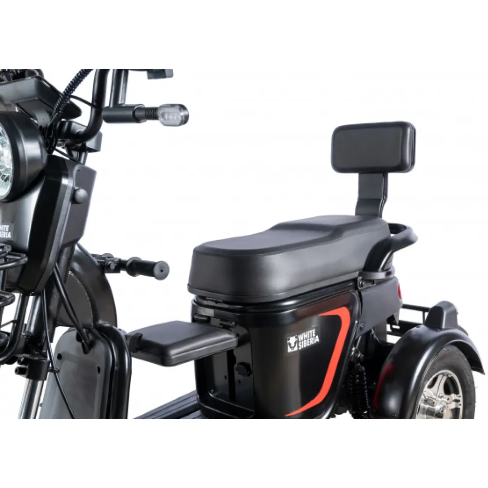 WHITE SIBERIA SIBTRIKE L 2000W – лидер продаж этого сезона. Удобный практичный электрический трицикл понравился семейным пользователям. Первое, что бросается в глаза, степень комфорта. Техника оснащена объемным сиденьем, одно из которых можно использовать в качестве пассажирского.
